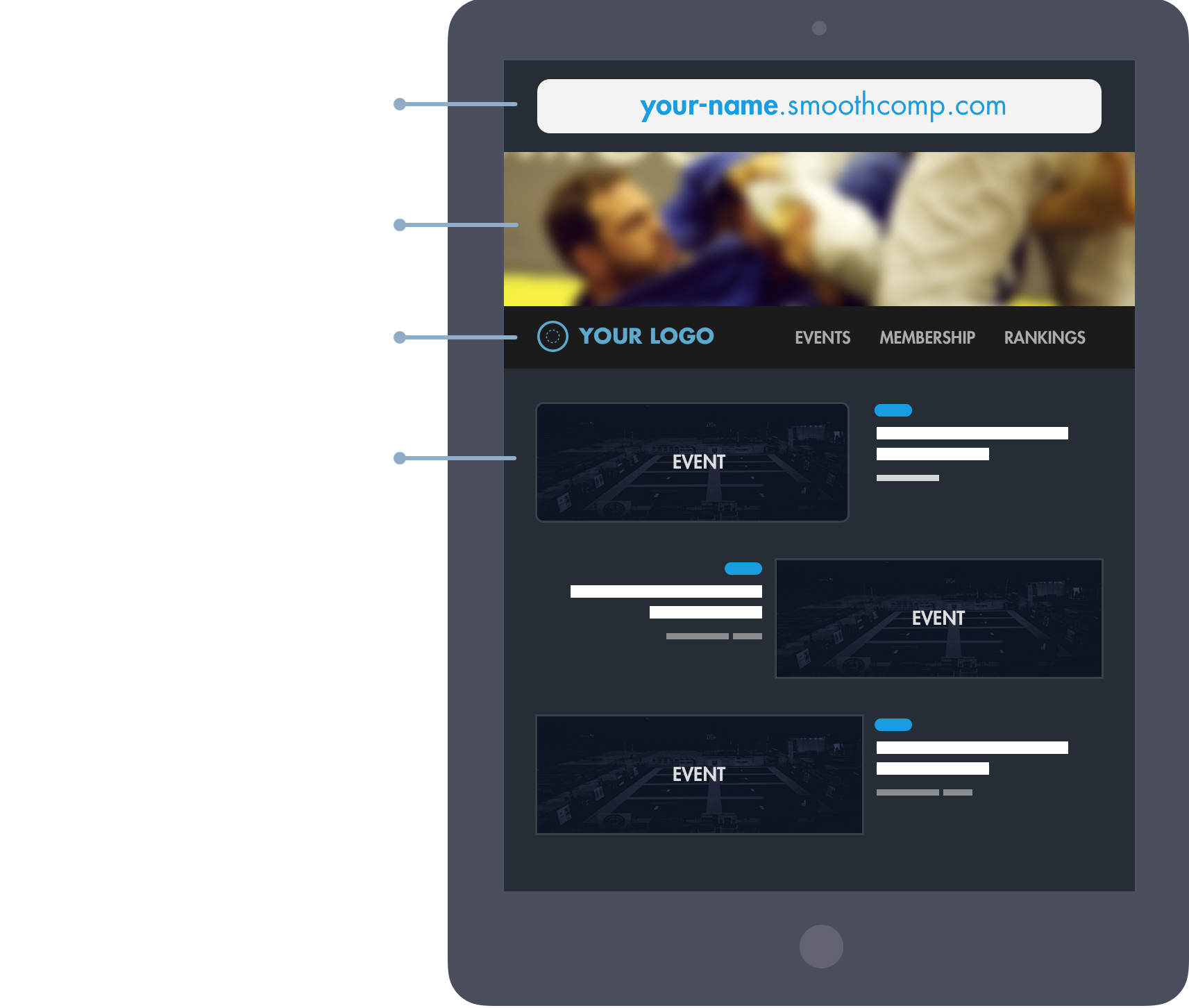 For federations and companies running several tournaments we can provide you with your-name.smoothcomp.com. On this customizable page you can gather all administration for your academies and tournaments in one place.